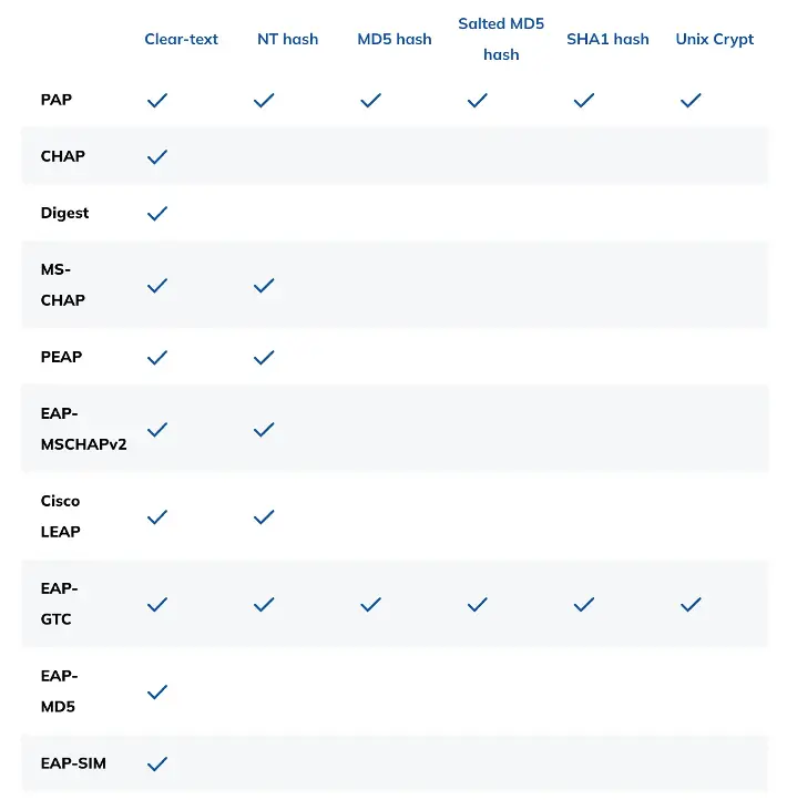 Authentication protocols used in RADIUS are not always compatible with the way the passwords have been stored. The following table shows which protocol is compatible with what kind of password.